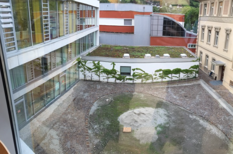 Der dreigeschossige, L-förmige Neubau bildet gemeinsam mit dem bestehenden Baukörper einen Innenhof der als Garten genutzt werden kann sowie einen Vorplatz am Eingang des Neubaus.