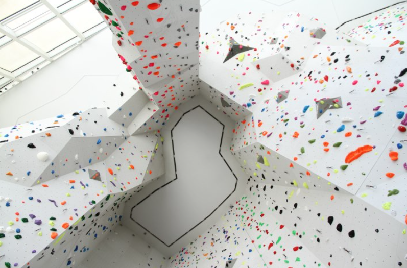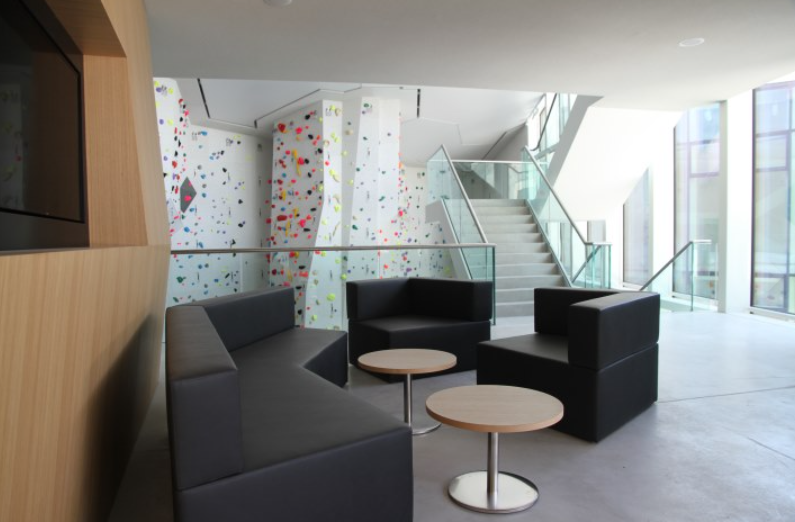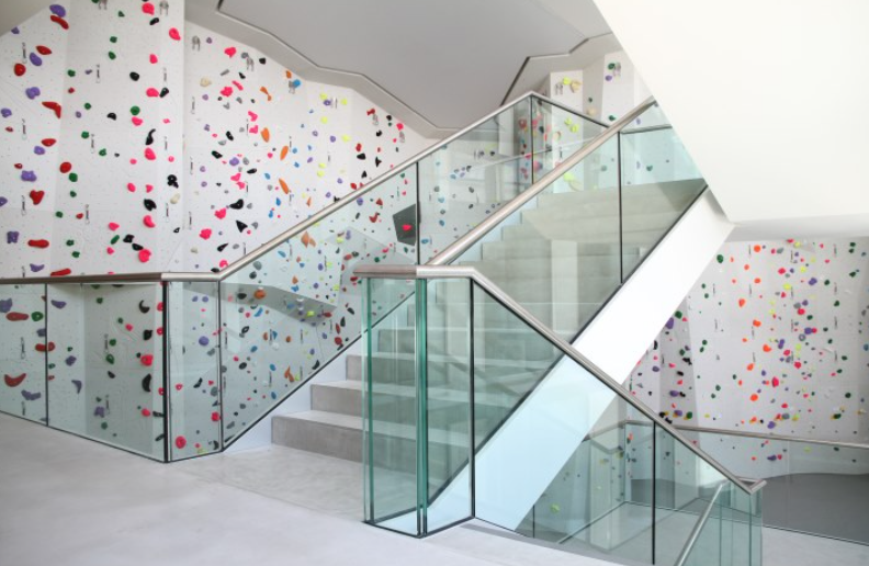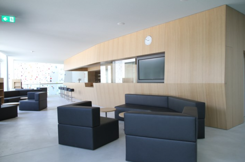 Die Anordnung aller Hauptnutzbereiche auf der tiefer liegenden Ebene -1 ermöglicht die zentrale und übersichtliche Unterbringung der Erschließungsflächen samt Umkleiden und Nebenräumen unterhalb des Innenhofes. Ein zusätzlicher Lichthof versorgt die Serviceräume der tiefer liegenden Ebene mit viel Tageslicht. Neben den Einblicken über die verglasten Außenfassaden, den vielfältigen Sichtbeziehungen in Foyer und Besuchergalerien, sind die Aktivitäten in den Kletterhallen optimal über die verglasten Innenwände einsehbar.