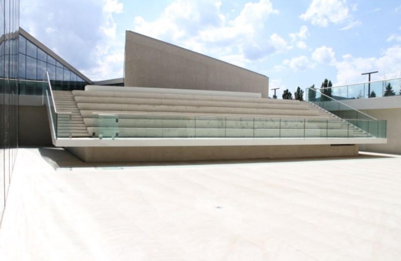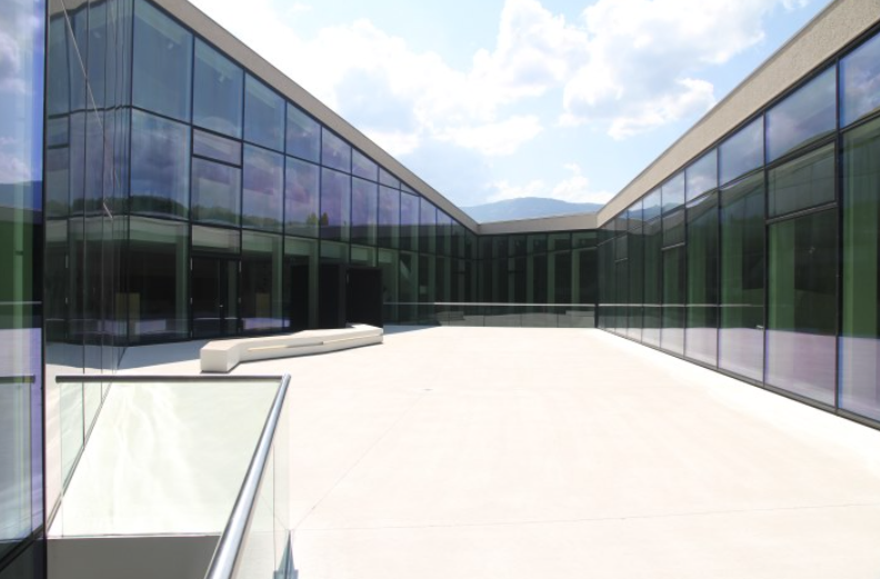 Das Gebäude besitzt eine hohe Wiedererkennung, zielt aber in seiner starken landschaftlichen Bezugnahme auf eine gute Integration in den umgebenden Natur- und Landschaftsraum. Es bedient sich weniger Details und Materialien, die massive Gebäudehülle ist fugenlos in Ortbeton mit gestockter Oberfläche und natürlichen Zuschlägen aus örtlichem Kalkgestein gefertigt. Die Dachfläche wird als fünfte Fassade interpretiert.