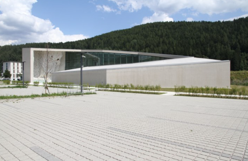 Die neue Kletterhalle steht im heterogenen Umfeld und in der speziellen Lage am Eingang der Schulzone Bruneck. Der Entwurf ist von elementarer Kraft und großer Zeichenhaftigkeit. Ein introvertierter Innenhof mit dem Vorplatz als Zuschauerbereich für verschiedenste Veranstaltungen und dem breiten Abstandsgrün zwischen Baukörper und Parkplatz reagiert in besonderer Art und Weise auf die städtebauliche Situation.