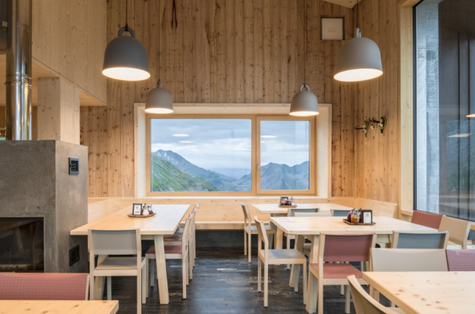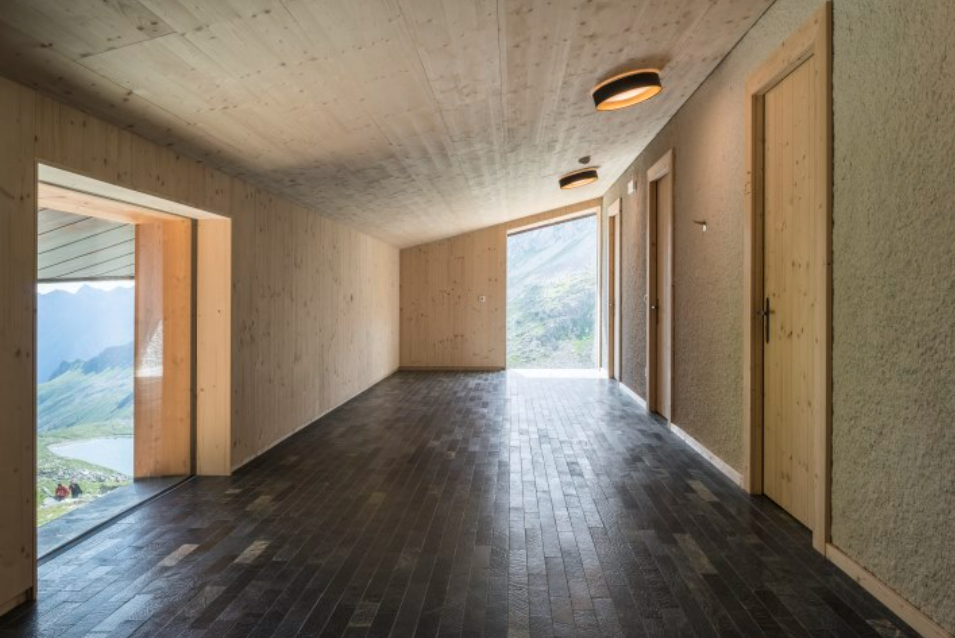 Die neue Schutzhütte besteht aus drei Stockwerken; von der Stube aus, kann man über große Fensteröffnungen die spektakulären Aussichten genießen. An die alte Schutzhütte erinnern die neue Terrasse, wo große Steinblöcke ihre Spuren und Größe erahnen lassen, die farbigen Fensterläden sowie die Holzverkleidung der neuen Hütte.