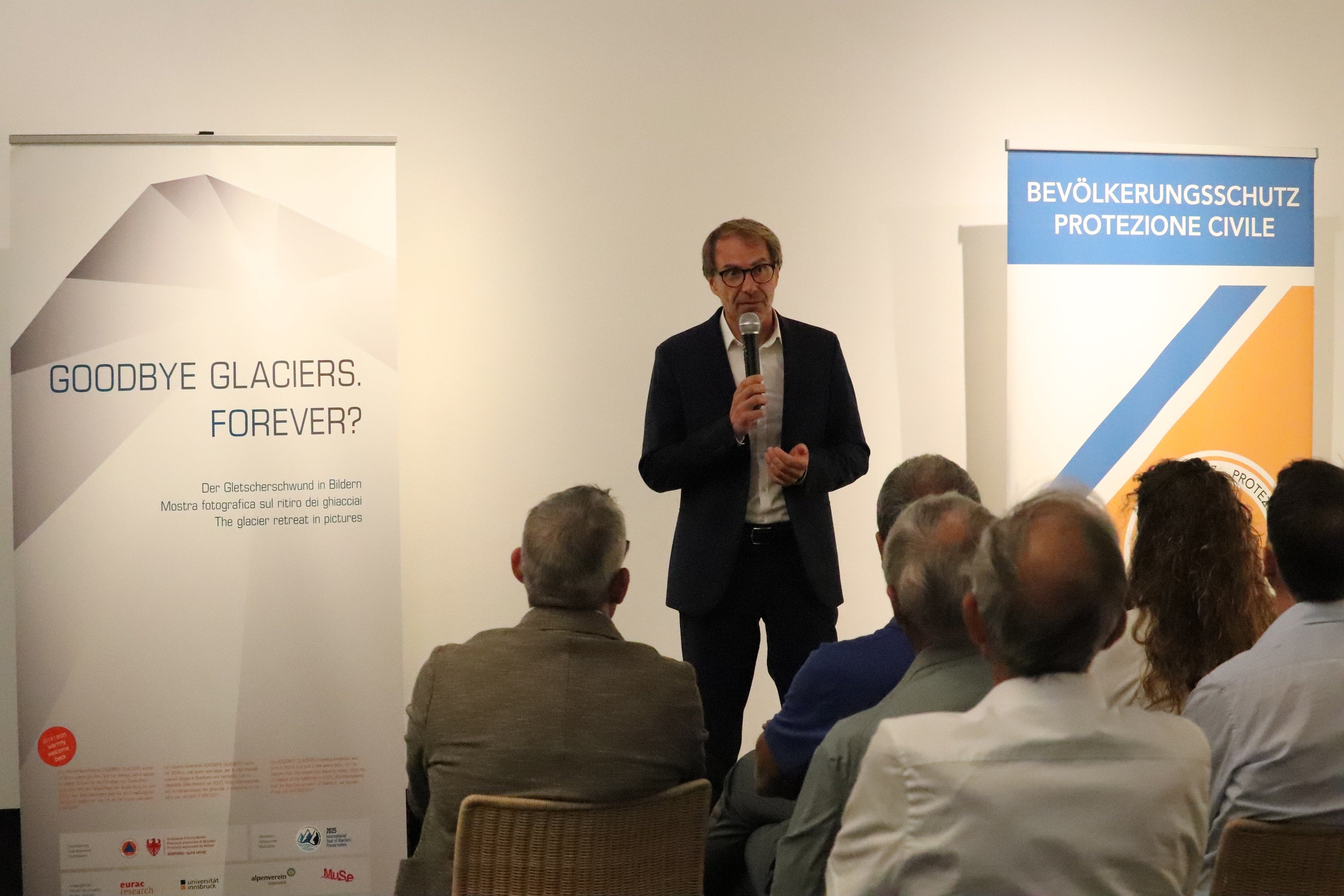 Der Direktor der Agentur für Bevölkerungsschutz Klaus Unterweger hob in seinen Grußworten die Wichtigkeit der Ausstellung als Instrument zur Sensibilisierung und Veranschaulichung des Klimawandels hervor. Wenngleich der Titel der Ausstellung auf den unausweichlichen Gletscherschwund hinweise, so müsse man doch gemeinsam mit der Bevölkerung zuversichtlich weiter am Klimaschutz arbeiten und Anpassungsstrategien entwickeln.