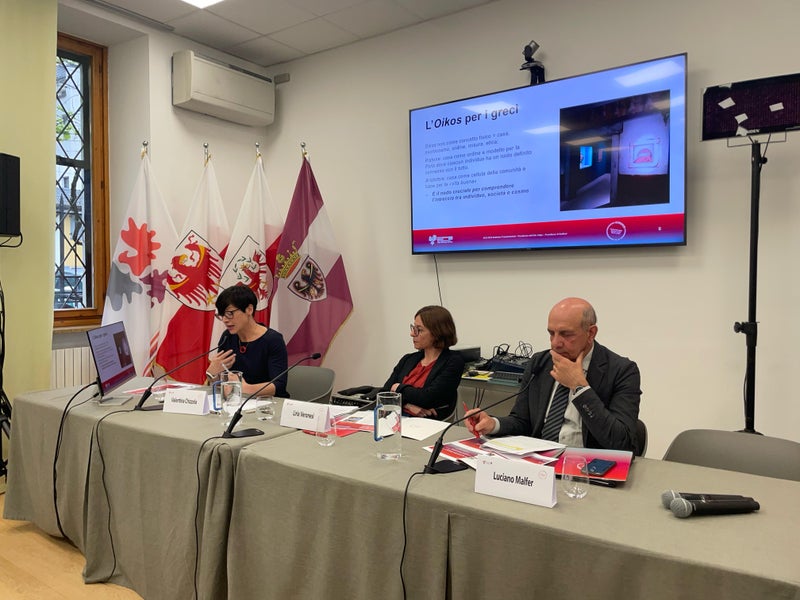 Euregio-Dienstag zum Thema "Nachhaltige Wohnmodelle" mit (v. l.) Luciano Malfer (FBK), Elisa Bertò (Euregio-Generalsekretariat) und dem Trentiner Landesrat für Wohnbau Simone Marchiori (Foto: Euregio)