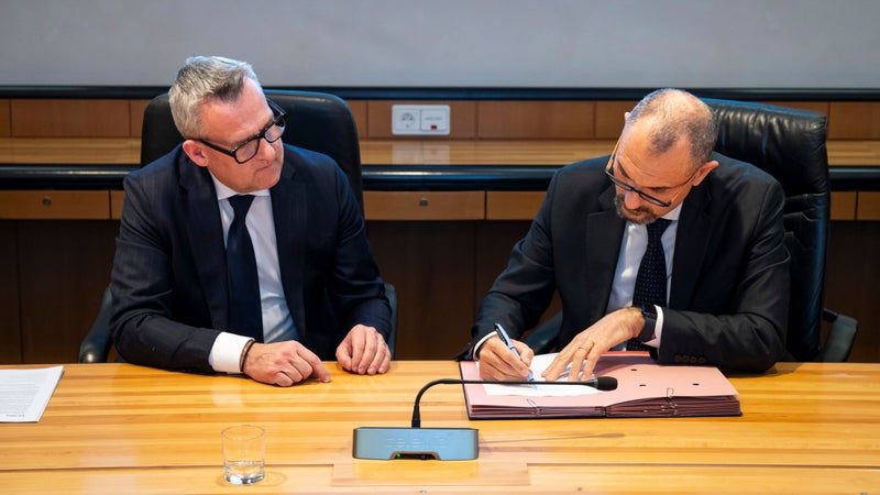 Vermögens-Landesrat Christian Bianchi und Vincenzo Fera, der Verantwortliche für Vermögen des NISF, unterschreiben Übertragung - Gebäude im Bereich des Siegesplatzes gehen ans Land Südtirol über