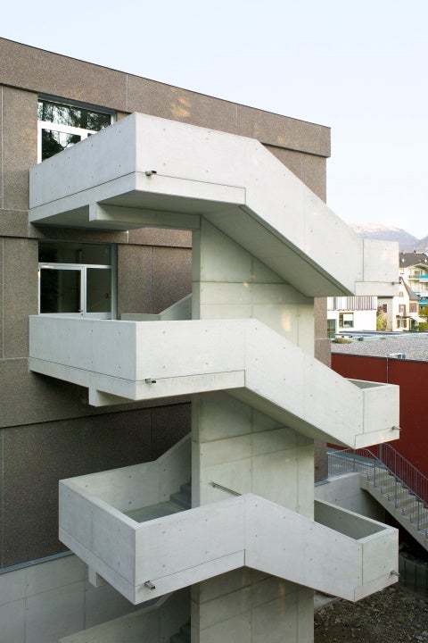 Diese Funktionen sind auf drei oberirdische Geschosse und ein Untergeschoss verteilt. Bemerkenswert ist das System der vertikalen Verbindungen, in dessen Mittelpunkt eine skulpturale Sichtbetontreppe steht, die sich vertikal kreuzt und die verschiedenen Ebenen des Gebäudes verbindet. Sehr gelungen ist das Zusammenspiel von vollen und leeren Fassadenflächen; massive und "schwere" Fertigteile mit einer Oberfläche, die den Porphyr der dahinter liegenden Felshänge aufgreift, und die großzügigen Öffnungen mit Metallrahmen, die die Südlage nutzen.