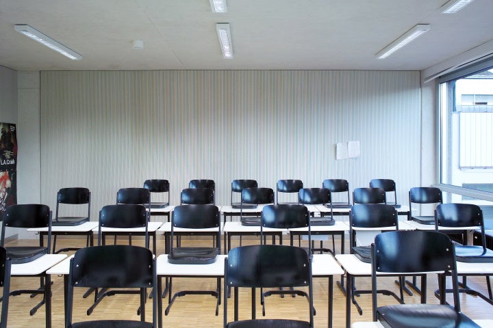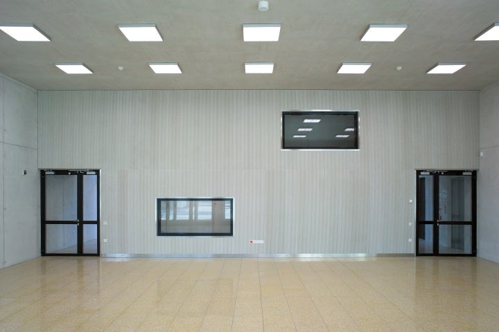 Die Innenräume sind mit Holzfußböden in den Klassenzimmern und Terrazzo in den Fluren ausgestattet.